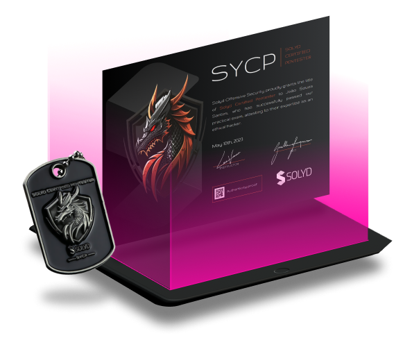 A certificação SYCP (Solyd Certified Pentester) comprova que o profissional possui as habilidades e conhecimentos necessários para atuar como um pentester. Para obter a SYCP, é preciso passar por um exame prático rigoroso de 72 horas, projetado para simular um cenário de pentest real. Durante o exame, o candidato deve demonstrar proficiência na execução de diversas técnicas de hacking ético para identificar e explorar vulnerabilidades em sistemas e redes. Além da exploração técnica, a certificação exige a elaboração de um relatório de pentest detalhado e profissional, documentando todas as etapas realizadas, as vulnerabilidades encontradas e as recomendações de segurança pertinentes. Um profissional certificado SYCP é capaz de conduzir testes de invasão abrangentes, analisar a segurança de ambientes corporativos, documentar suas descobertas de forma clara e técnica, e fornecer recomendações eficazes para a mitigação das vulnerabilidades.